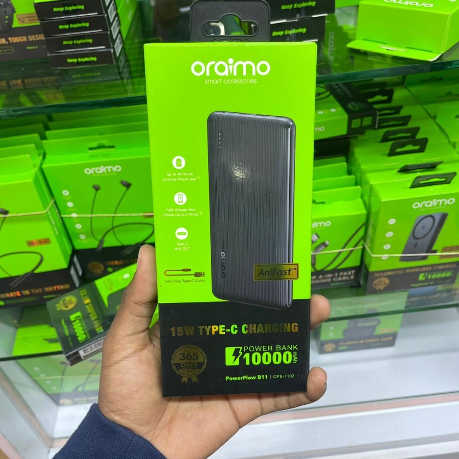 Oraimo PowerFlow B11 10000mAh power bank delivers reliable 15W charging with Type-C input/output and dual USB-A ports. Designed for everyday use, it provides up to 2 full phone charges and extended battery life on the go.